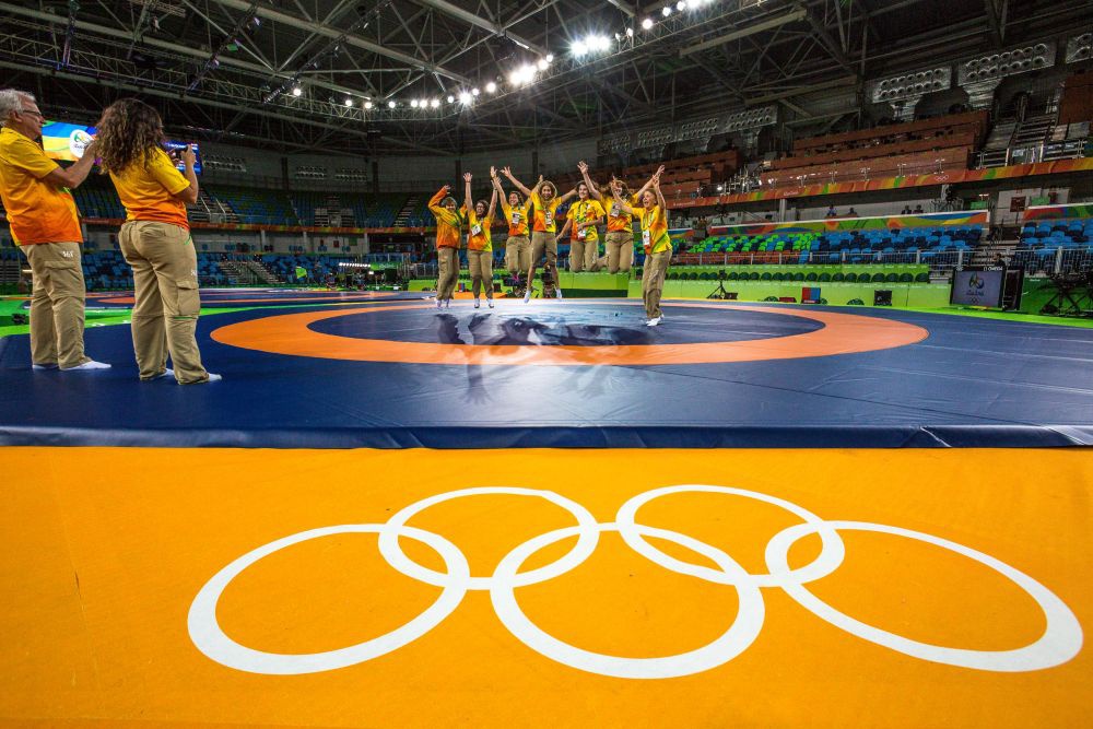 2016年8月18日,在里约奥运会摔跤场馆内,场馆工作人员和志愿者在摔跤垫上合影留念,这届奥运会的摔跤垫来自中国乐鱼体育集团。新华社记者刘彬摄